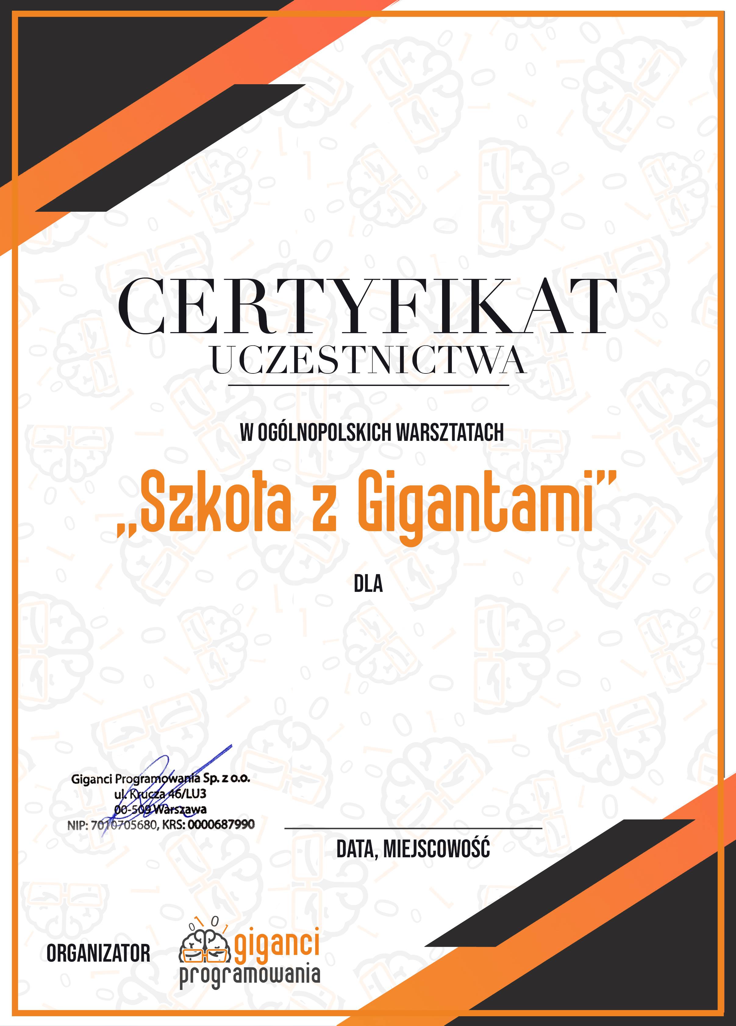 >>Wzór certyfikatu dla szkoły<<